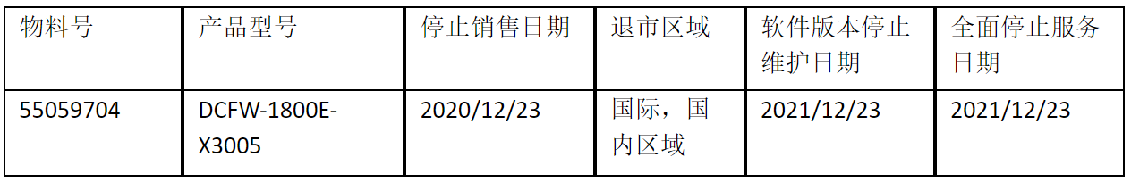 北京evo视讯真人官网云科信息技术有限公司正式通知您, 以上DCFW-1800E-X3005下一代防火墙(55059704)将于20201223号停止接收新的订单(具体日期见上表),不再供货。给您带来的不便,敬请原谅。